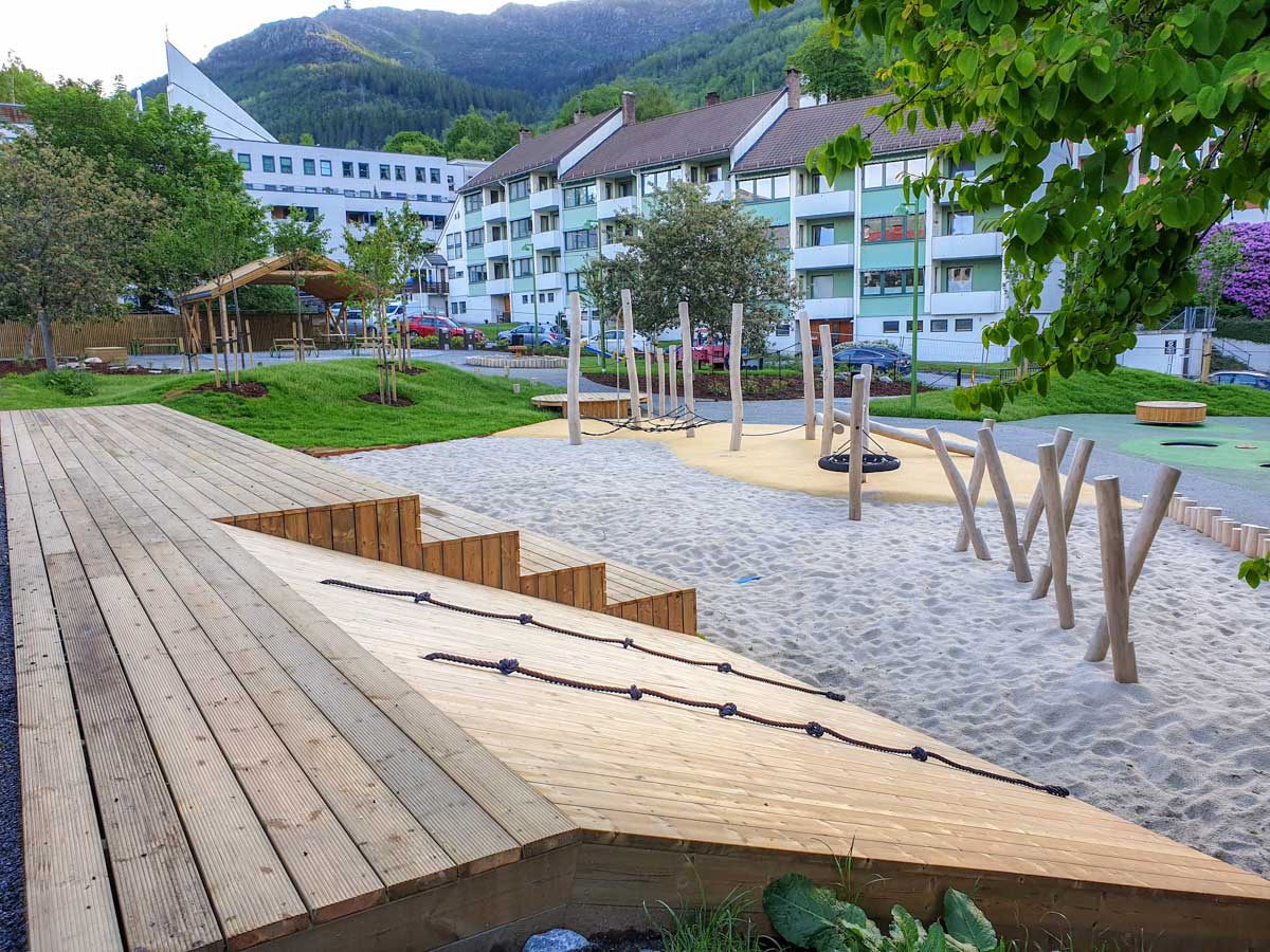 Tveiteparken lekeplass oppgraderes for Bergen Kommune som musikk og sanselekeplass. I Tveiteparken monterer vi diverse aktivitets utstyr, rutsjebane fra fjell, trampoliner, line mellom trær.